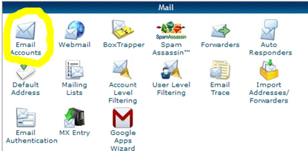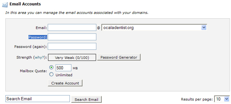 Here you can add new email accounts. The drop down arrow will show your principal domain name and any domain names that have been added with cpanel under Add On Domains. Simply select a user name and password after setting the dropdown arrow to the proper domain.