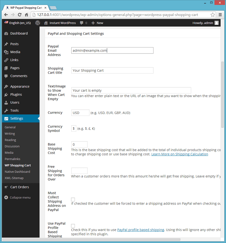 - To create a new item to sell using PayPal, navigate to Settings > WP Shopping Cart. Ensure that you accurately enter your PayPal email address. Fill in the other required details and enter the standard three-letter currency code in the Currency field. Click on “Update Options” to save your changes.