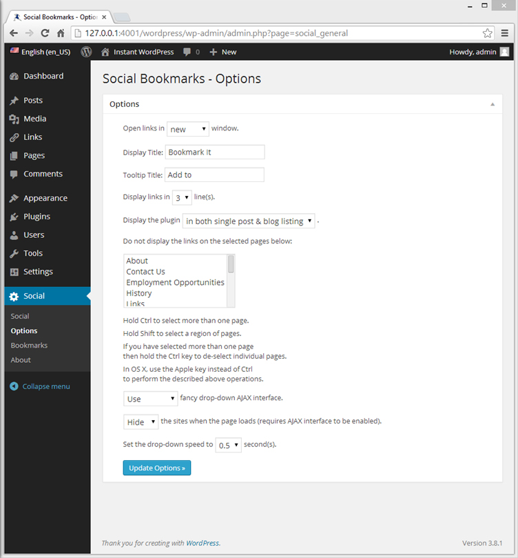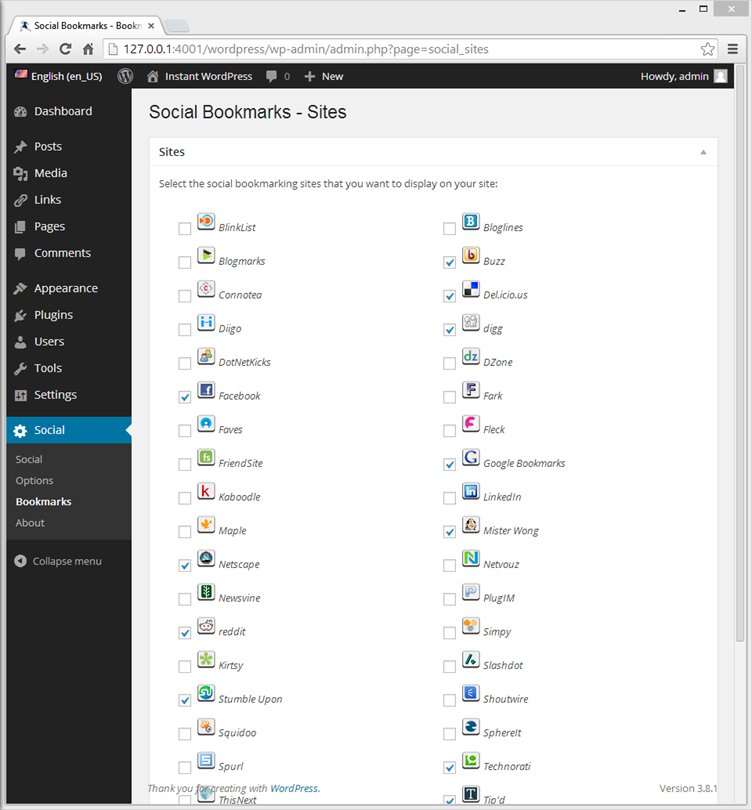 - By default, only a few social media buttons for the most popular networks will be displayed, although the plugin supports many more. You can choose which buttons to display by clicking on the “Bookmarks” section on the Social page. Select the ones you want and click on “Update Options”. It’s best to only choose the most popular social media networks, such as Facebook and Twitter, as well as those most relevant to your website or the ones you personally use. Selecting too many buttons will confuse readers and clutter your page footers.