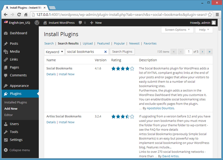 - Type “Social Bookmarks” in the search box and click on “Search Plugins”. The Social Bookmarks plugin should appear at the top of the results. Click on “Install Now” to install the plugin and then click on “Activate Plugin” once it’s installed.