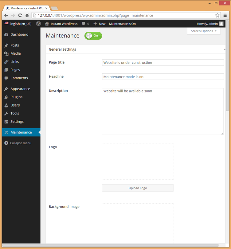 - A brand new part will seem within the administrator dashboard facet panel entitled “Upkeep”. Click on on it to customise your upkeep web page. By default, upkeep mode might be activated as quickly as you energetic the plugin.