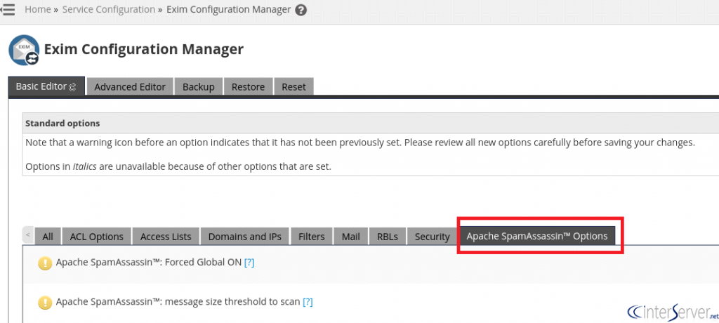 4) Choose “Basic Editor” option and select the “Apache SpamAssassin™ Options” tab.