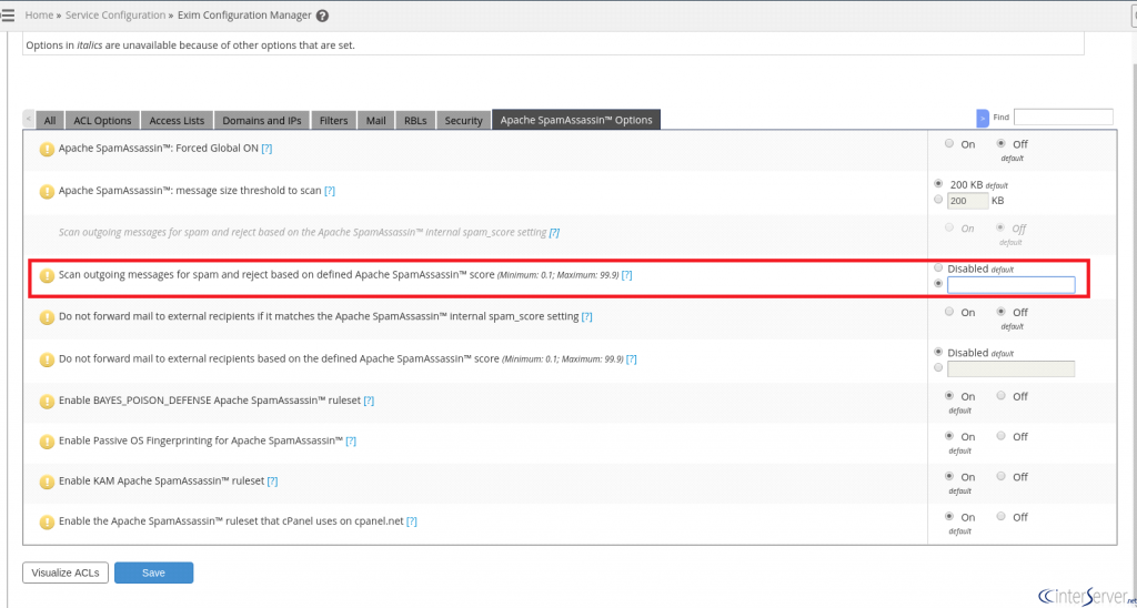 SpamAssassin is a software which is used for detecting spam messages by examining the content of an email message and assigns it an overall score. The score is based on the amount of spam-related traits that SpamAssassin finds within the message. If the message’s score exceeds a predefined limit, SpamAssassin discards it as spam. By enabling SpamAssassin to filter outgoing emails for spam it should limit this issue, and you don’t have to worry about emails getting bounced. In WHM, there is an option under exim configuration manager to scan outgoing messages for spam and reject based on defined SpamAssassin score. This option allows you to set the spam score threshold that SpamAssassin will use to determine when it will reject messages sent to non-local domains. In other words, it will scan and reject mail bound for non-local domains that Apache SpamAssassin™ classifies as spam.