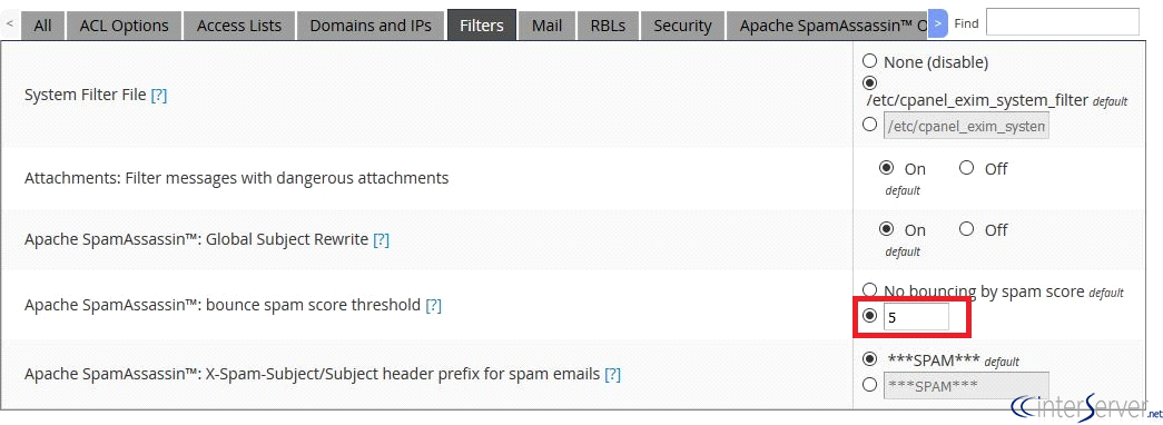 4) Now you can set Apache SpamAssassin™: bounce spam score threshold to 4. Then we get bounce back mail when the spam score is above this number. (positive or negative, single digit after a decimal point allowed). By default, the settings are set to No bouncing by spam score but we can change the settings to secure the server.