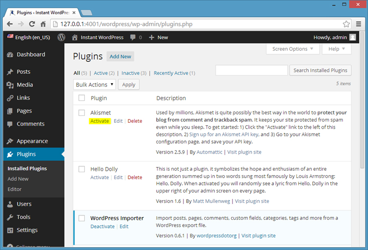 - Log in to your WordPress administrator dashboard and go to the Plugins web page. Find the Akismet plugin and click on “Activate” simply beneath it.