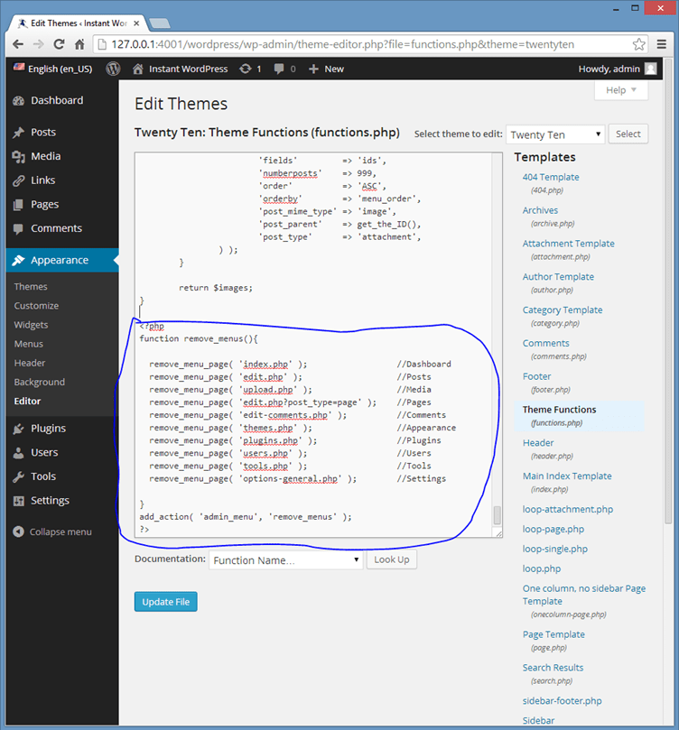 - Save your changes by clicking “Update File” at the bottom of the page. If you change your theme, you will need to edit the functions.php file again, as this code is specific to the currently activated theme and not the WordPress platform itself.