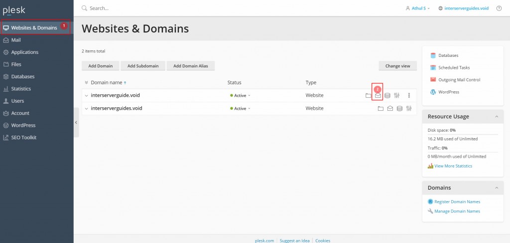 2: Click on the “Websites & Domains” option from the left tab. Click “Mail” icon listed on the right side of the page.