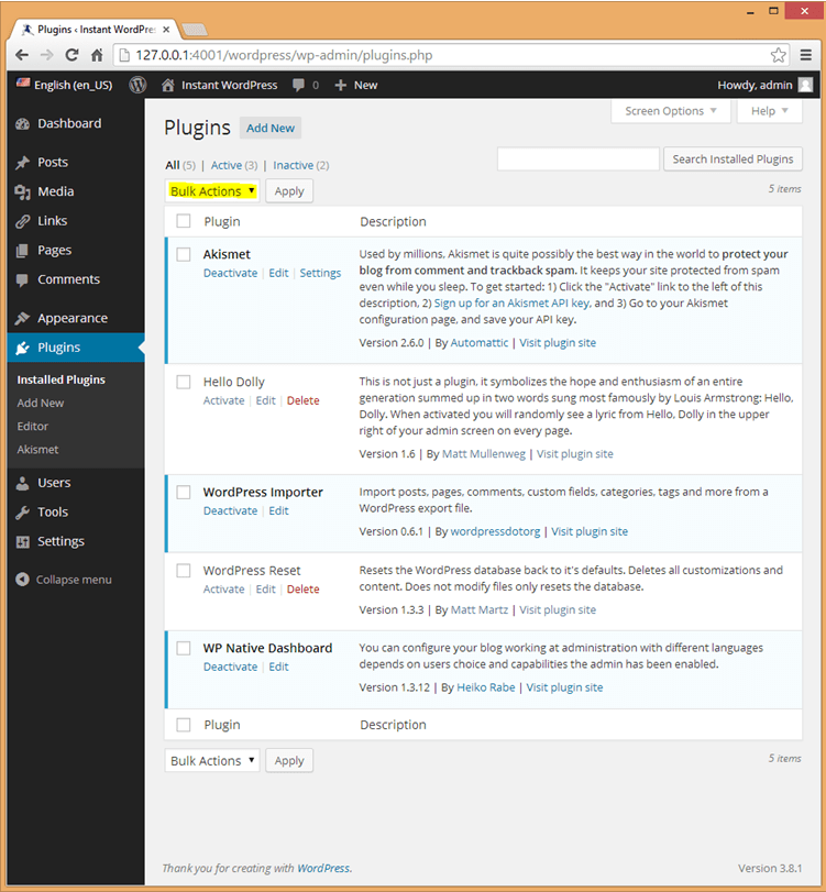 - To disable plugins in bulk, examine the containers beside the plugins you need to disable. Alternatively, choose all plugins by checking the field on the very high of the checklist beside the place it says “Plugin”. From the “Bulk Actions” dropdown field on the high of the web page, click on “Deactivate” and click on “Apply”.