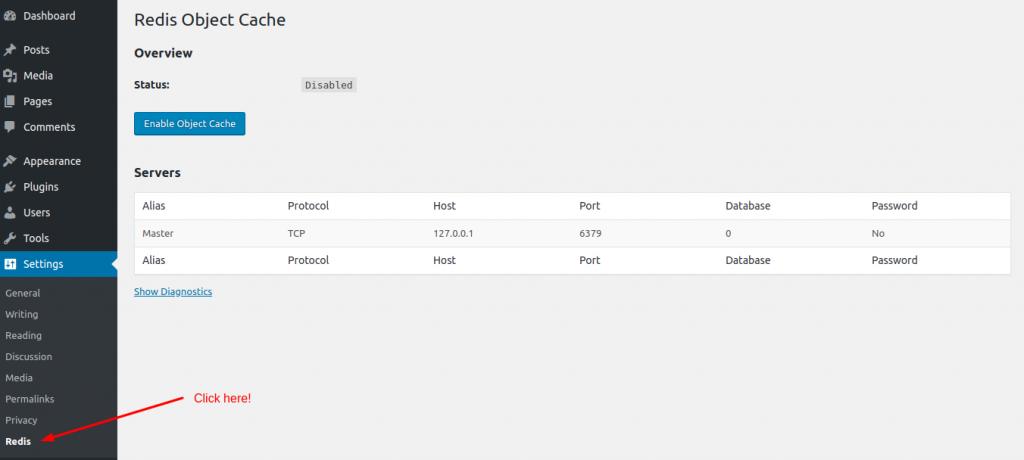 Now, Click on on the “Settings” menu from the appropriate sidebar of the WordPress admin panel. After which click on on the “Redis” sub-menu inside Settings similar to the next picture.