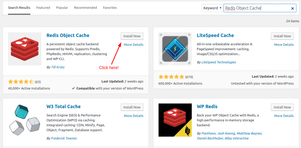 Now, Seek for “Redis Object Cache” plugin and set up the one given within the screenshot under.