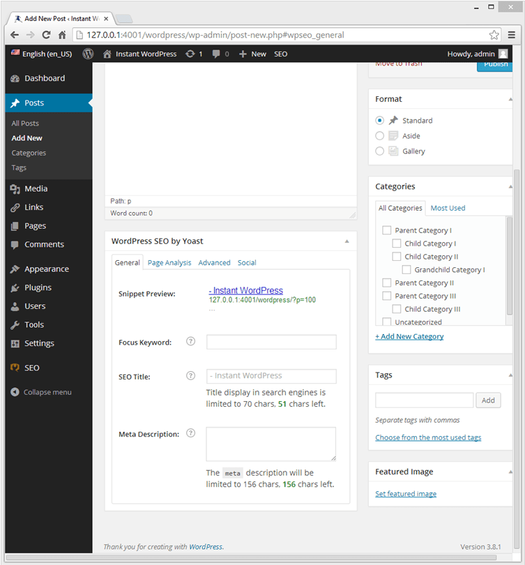 - Create or edit a brand new put up or web page. Extra performance put in by the plugin will seem in a brand new part entitled “WordPress Web optimization by Yoast” beneath the textual content editor.